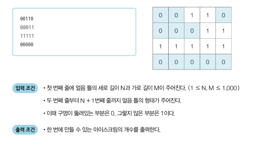 이때 얼음 틀의 모양이 주어졌을 때 생성되는 총 아이스크림의 개수를 구하는 프로그램을 작성하라.
